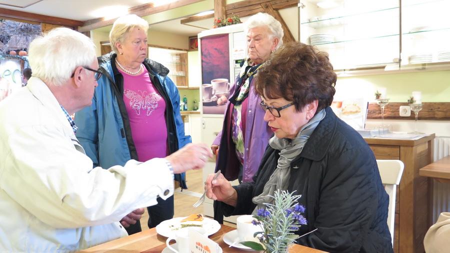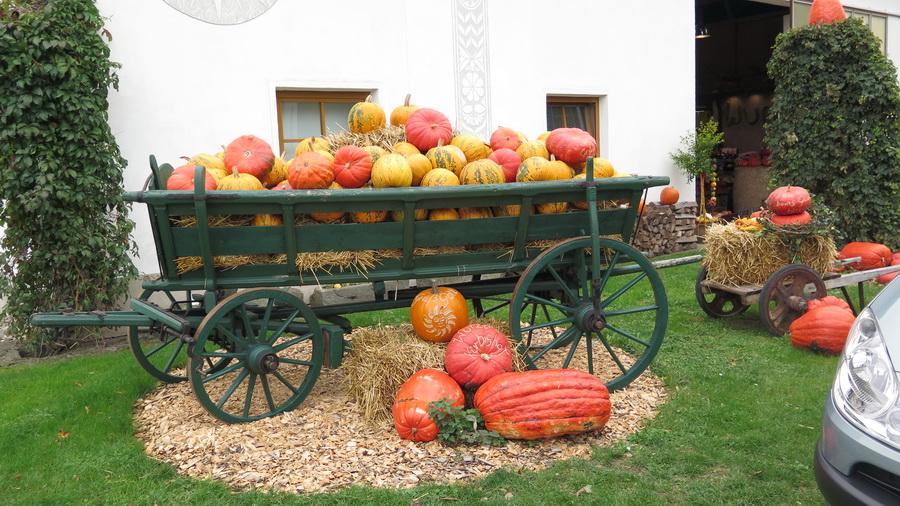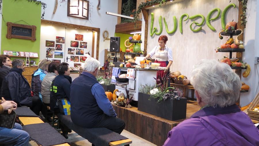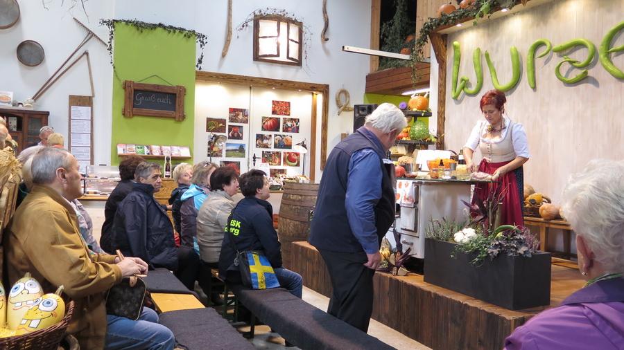 Beim amüsanten Schaukochen erfuhren wir alles Wissenswerte über den Kürbis in der Küche. Beim Rundgang durch den Bauerngarten bestaunen wird die mächtigen Riesenkürbisse. Danach folgte die genussreiche Verkostung der hausgemachten Spezialitäten: Von viel prämierten Likören, Bränden, Marmeladen bis hin zum Kürbiskernöl.